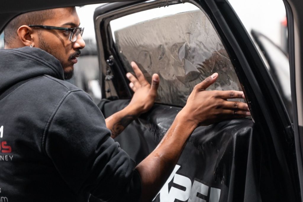 A professional installer wearing glasses and a black hoodie carefully wipes down a tinted car window with a microfiber cloth. The dark tint reflects the surroundings, while a large sign in the background hints at an automotive shop setting. The attention to detail highlights the protective benefits of window tint, including added safety in case of accidents.